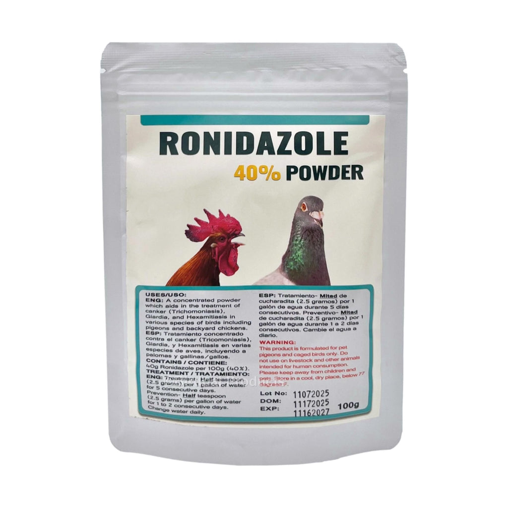 Ronidazole 40% Powder is a potent, concentrated treatment formulated to combat three significant infections in pigeons and backyard chickens: canker (Trichomoniasis), Giardia, and Hexamitiasis. This pharmaceutical-grade powder delivers reliable therapeutic results when administered through drinking water. The 40% concentration offers a substantial advantage over standard 10% formulations-- a single 100-gram pouch treats four times the volume of water, making it an economical choice for flock management and long-term treatment protocols.